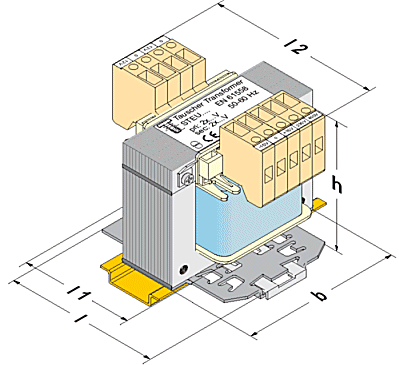 Die Anforderungen an Steuer-, Sicherheits- und Trenntransformatoren werden erfüllt. Die Einschaltströme und das Kurzschlussverhalten der Transformatoren sind optimal auf die Verwendung von Motorschutzschaltern mit thermischer und magnetischer Abschaltung im Primärkreis abgestimmt. Die weltweit festgelegten Normspannungen 230 V und 400 V nach DIN IEC 60038 sind primärseitig vorhanden. Eine Spannungsanpassung mit +- 15 V ist auch vorhanden. Die Transformatoren haben standardmäßigen Feuchteschutz durch Imprägnierung. Die verwendeten Klemmen sind berührungssicher nach VBG 4. Die Befestigung erfolgt über Fußwinkel oder Tragschienenmontage. Die Einbaulage kann beliebig gewählt werden.