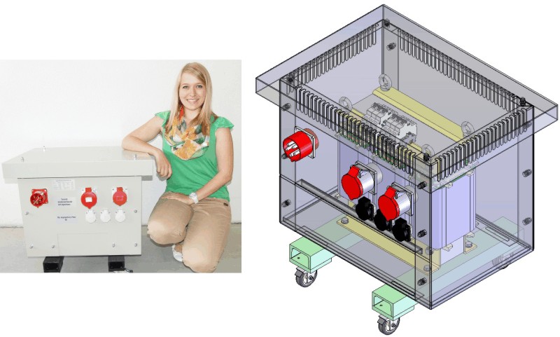 Wir bauen einen Drehstromtransformator Dy5n mit Kühlkanälen und sicherer galvanischer Trennung mit 5 kV Spannungsfestigkeit und leichter Glättung von Spannungsspitzen aus dem Versorgungsnetz. Die Transformatorverluste betragen gesamt nur 2% oder 250 Watt unter voller Belastung. Der Labortransformator bekommt einen dreiphasigen 32 A Anschluss, einen dreiphsigen 16 A Anschluss und drei einphasige 10 A Anschlüsse. Das IP 23 Gehäuse hat Lenk- und Bockrollen und an der Vorderwand die verschiedenen CEE Steckdosen. Eingebaute Sicherungsautomaten mit träger Kennlinie schützen die Stromkreise.